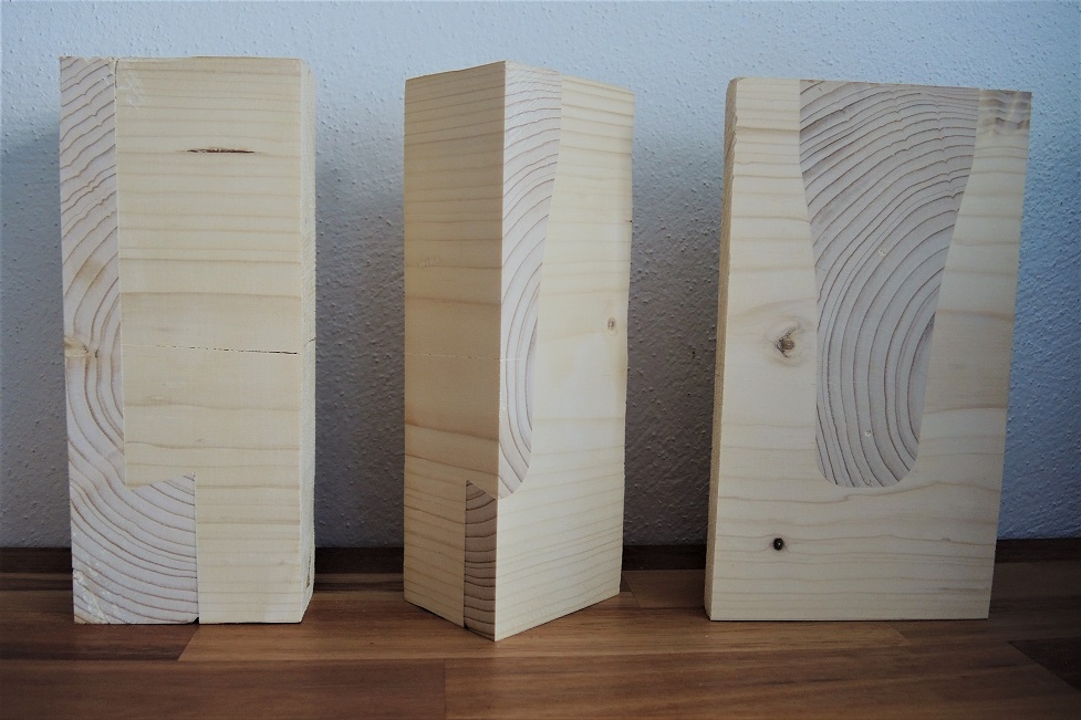 Im rechten Querschnitt sehen sie die besondere Form des Zapfens sehr gut. Er ist unten schmäler und wird nach oben hin deutlich breiter. Das hat gegenüber stumpfen Winkeln den Vorteil, dass hier wesentlich mehr Holz am Zapfen stehen bleibt und auch mehr Obholz zur Verfügung steht. Dadurch ist die Tragkraft erhöht. Sie sehen in der Schnittzeichnung links im Bild ist rechts der Balken und links der Träger. |